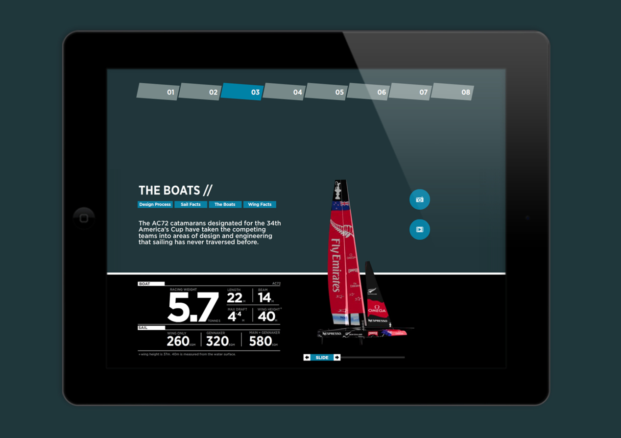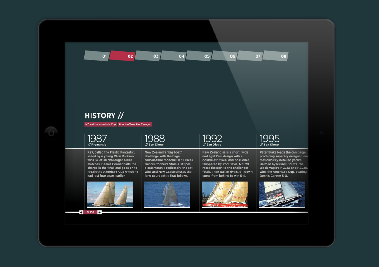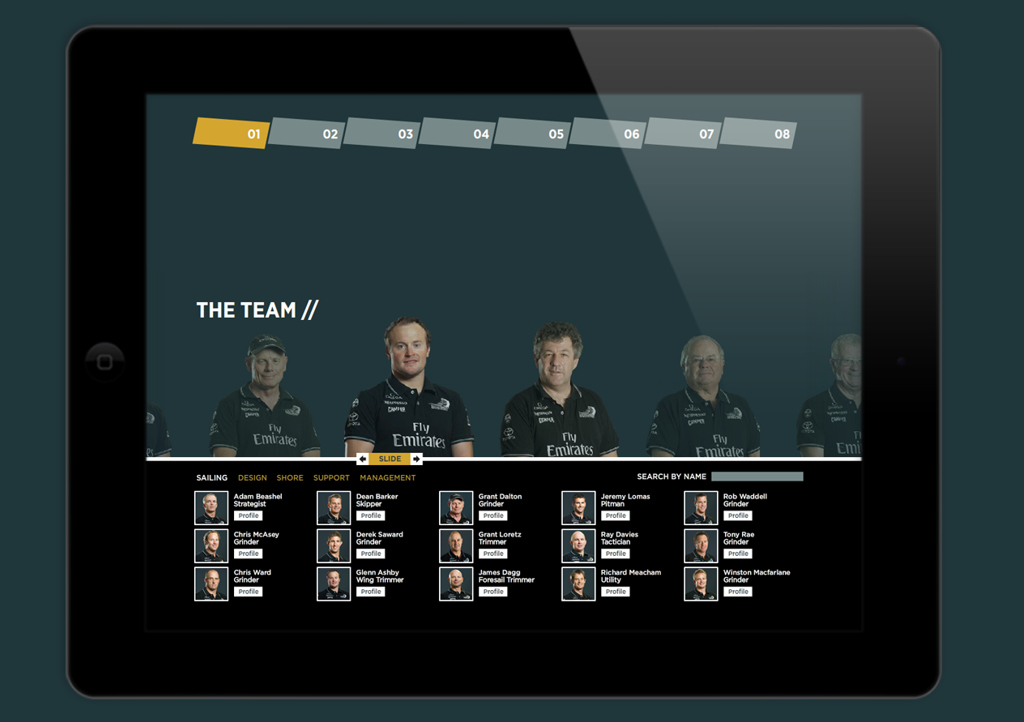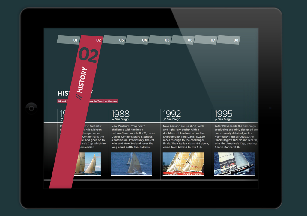 The required media kit needed to represent the team’s professionalism and innovative thinking, and deliver multi-media resources that built on the excitement and pride of the Team NZ challenge while engaging media in a myriad of detailed and technical information. While creating a rich website to house all the history, photo and video library, team and boat data would have been the most obvious (and easiest) solution, what Team New Zealand actually needed required a different solution. Firstly, Team NZ wished to present a ‘tangible’ media kit to media gathered at an important arrival function in San Francisco. And secondly, the data needed to be at hand for the world’s journalists whether they were internet-connected or not – a state not always possible on media craft or chase boats when filing stories.